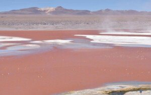 La piste se poursuit à travers les superbes paysages du désert de Siloli et son fameux « arbre de pierre », avant d’arriver à la laguna Colorada dans l’après-midi.